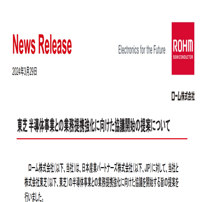 ROHM announced that it has proposed to strengthen its business alliance with Toshiba in the semiconductor business. In addition to the manufacture of power semiconductors, we aim to strengthen our competitiveness in the increasingly competitive semiconductor market and enhance our corporate value by strengthening our collaboration in a wide range of fields, including technology development, parts procurement, and logistics.