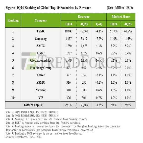 Foundry sales for the first quarter of 2024 declined 4.3% quarter-over-quarter to $29.17 billion, with overall growth slowing. China SMIC moved up to third place, overtaking GlobalFoundries and UMC. TSMC remains in first place, but is down 4.1% quarter-on-quarter to $18.85 billion. Samsung came in second with a 7.2% decline to $3.36 billion. While demand for AI servers is strong, the impact of economic conditions and geopolitical risks remains a concern.