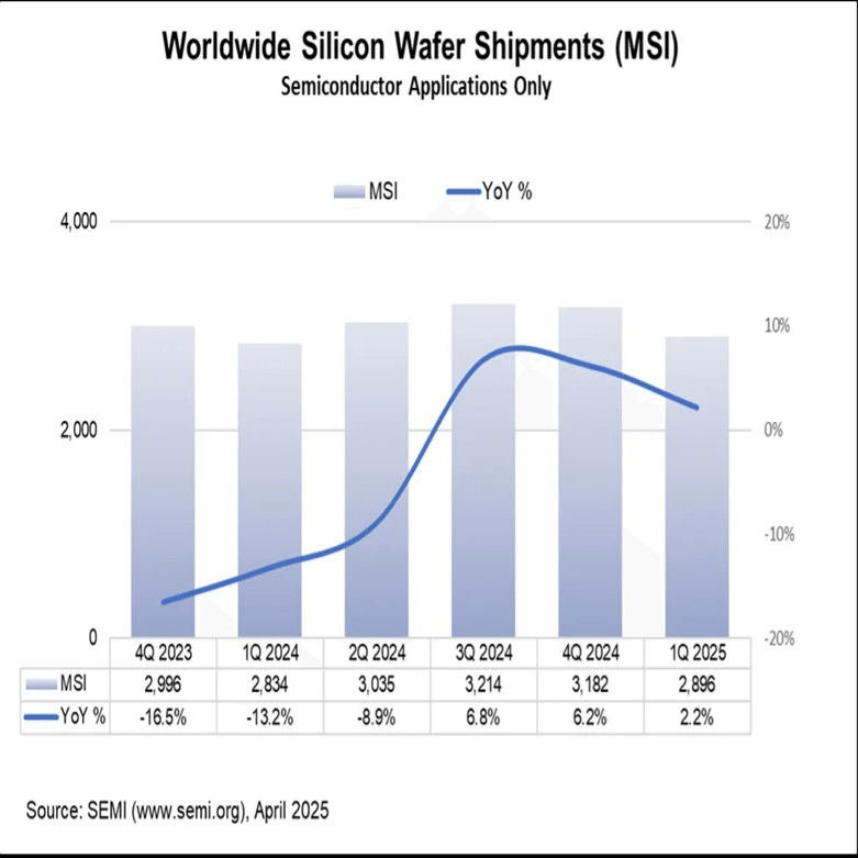 Silicon wafer shipment area in 1Q 2025 increased 2.2% year-on-year, but decreased 9.0% quarter-on-quarter due to inventory adjustments and seasonal factors, with a clear difference between the trends of 300mm and small-diameter wafers.